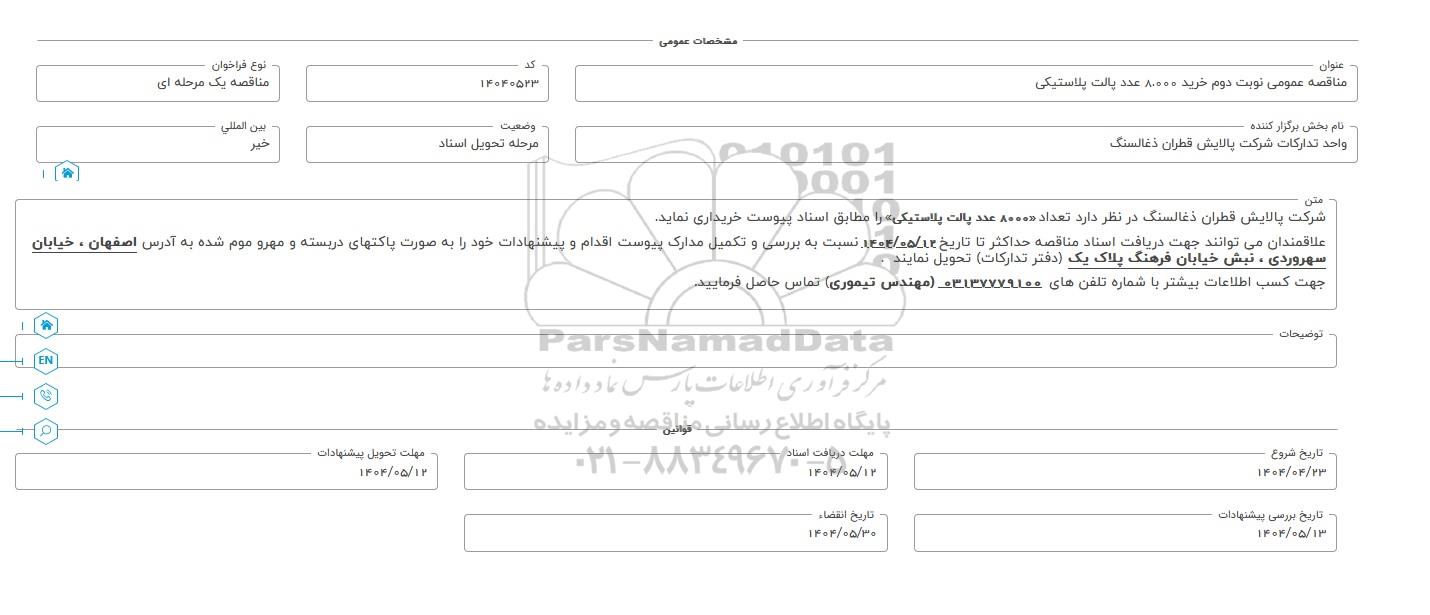 علاقمندان می توانند جهت دریافت اسناد مناقصه حداکثر تا تاریخ 1404.05.12 نسبت به بررسی و تکمیل مدارک پیوست اقدام و پیشنهادات خود را به صورت پاکتهای دربسته و مهر و موم شده به اصفهان، خیابان سهروردی، نبش خیابان فرهنگ پلاک یک (دفتر تدارکات) تحویل نمایند.