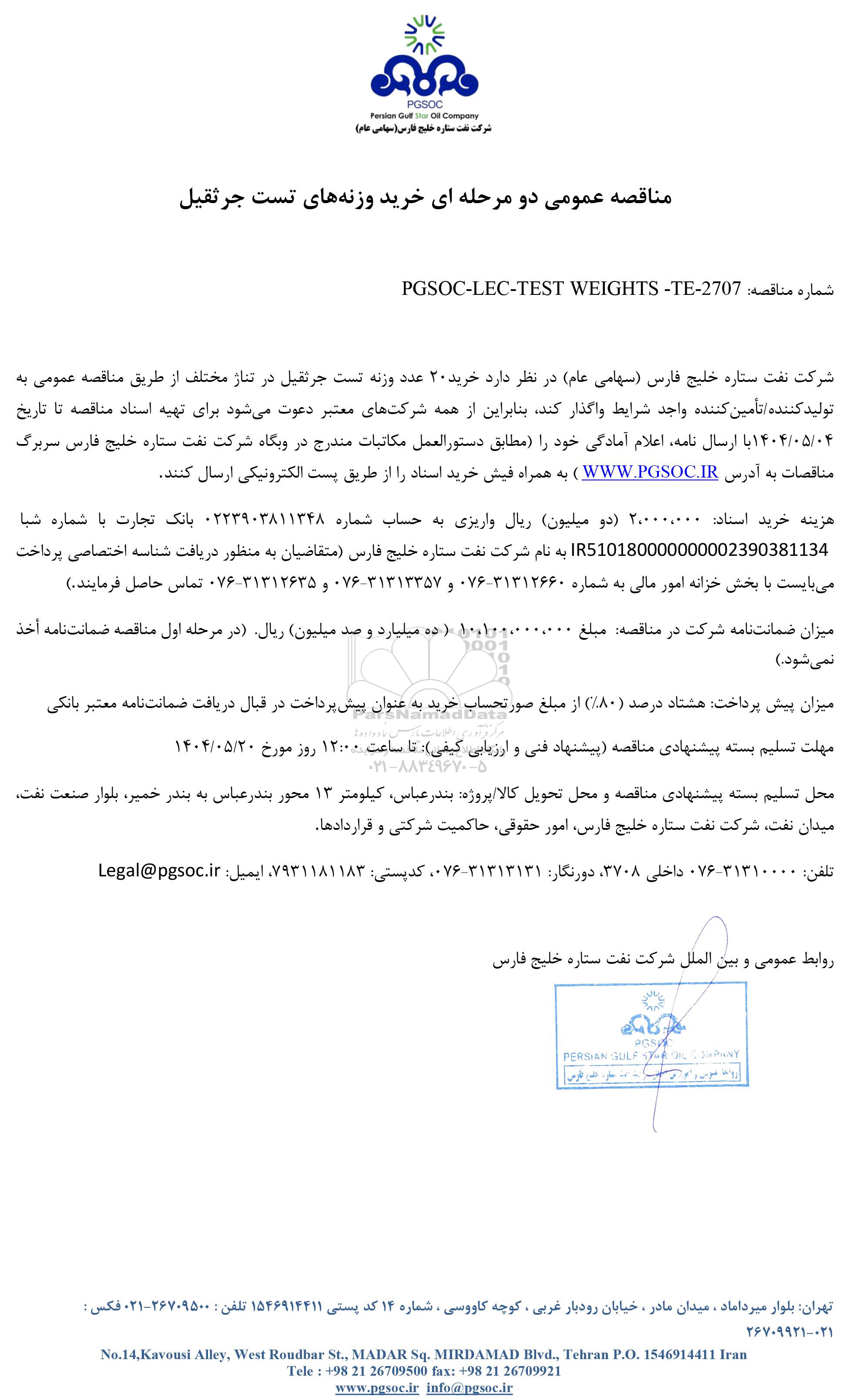 شماره مناقصه: PGSOC-LEC-TEST WEIGHTS -TE- 2707