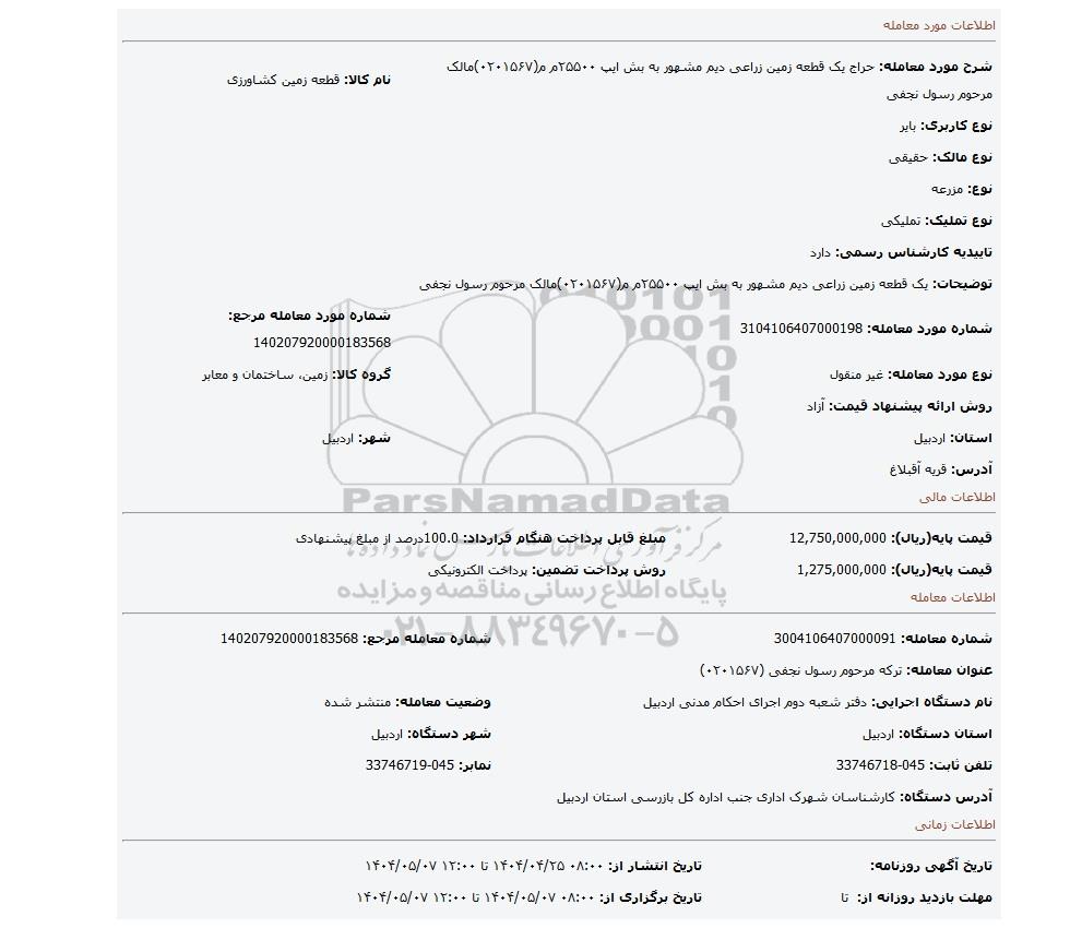 شرح مورد معامله: حراج یک قطعه زمین زراعی دیم مشهور به بش ایپ ۲۵۵۰۰م م(۰۲۰۱۵۶۷)مالک مرحوم رسول نجفی | نام کالا: قطعه زمین کشاورزی | |