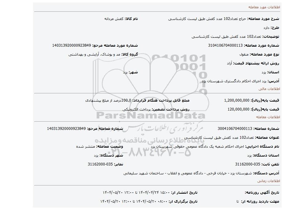 | توضیحات: تعداد102 عدد کفش طبق لیست کارشناسی | ||