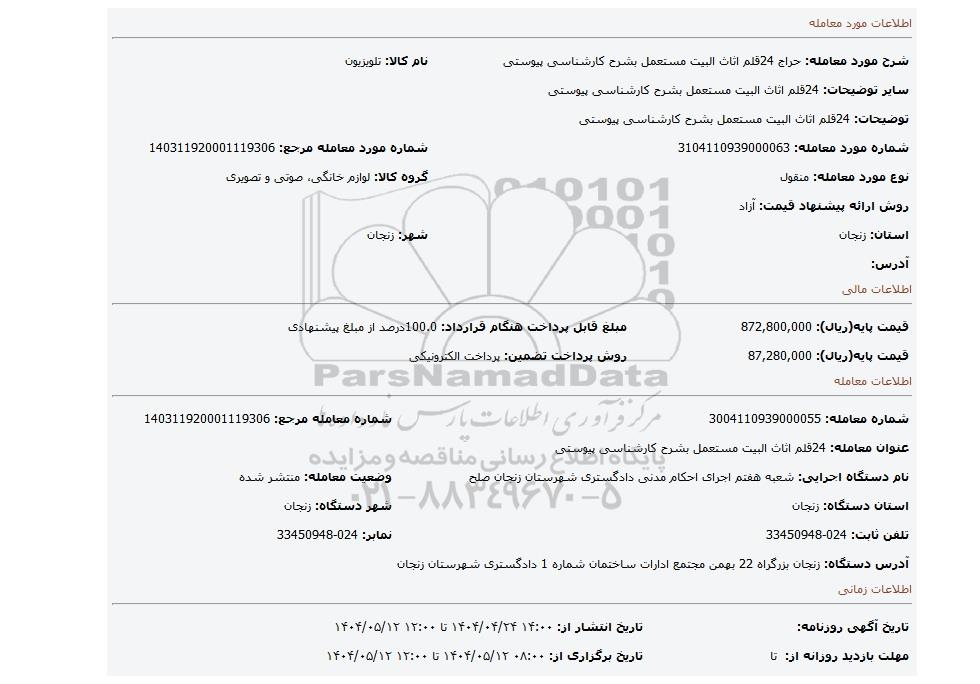 | سایر توضیحات: 24قلم اثاث البیت مستعمل بشرح کارشناسی پیوستی | ||