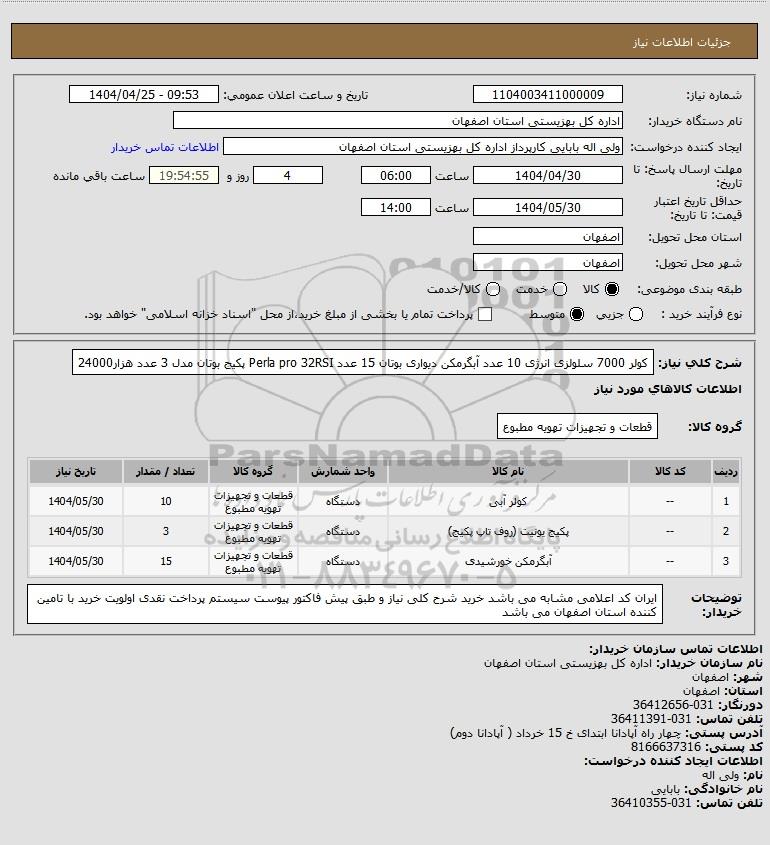 | 1 | -- | کولر آبی | دستگاه | قطعات و تجهیزات تهویه مطبوع | 10 | 1404/05/30 |