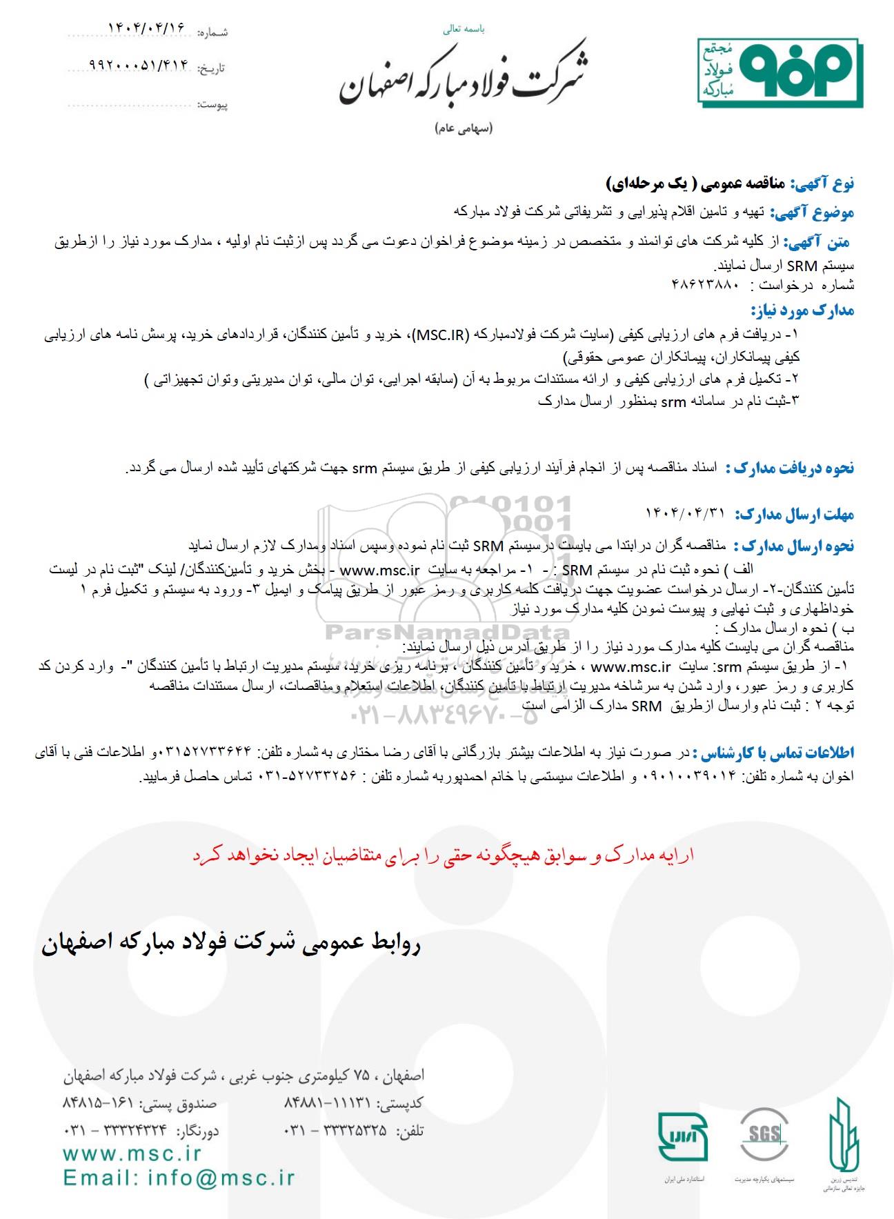 موضوع آگهی: تهیه و تامین اقلام پذیرایی و تشریفاتی شرکت فولاد مبارکه
