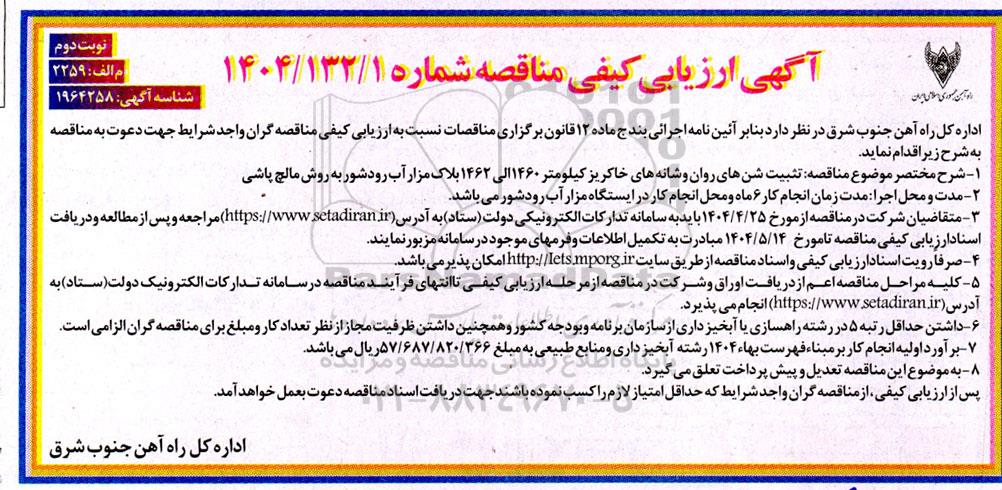 ارزیابی کیفی مناقصه تثبیت شن های روان و شانه های خاکریز کیلومتر ...- نوبت دوم از کلیه افراد متخصص و شرکت‌ها واجد شرایط دعوت به عمل می‌آید در مناقصه با کد خبرگزاری پارس نماد: 9281081 شرکت نمایند. این مناقصه در تاریخ 1404/04/25 شروع و مهلت آن تا تاریخ 1404/05/14 میباشد.