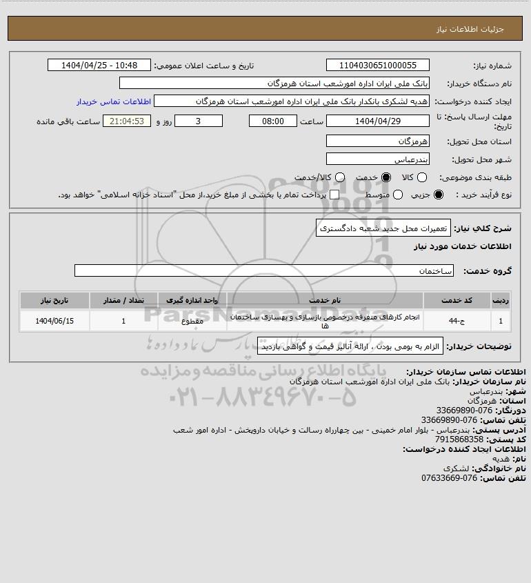 استعلام تعمیرات محل جدید شعبه دادگستری, استعلام تعمیرات محل جدید شعبه دادگستری