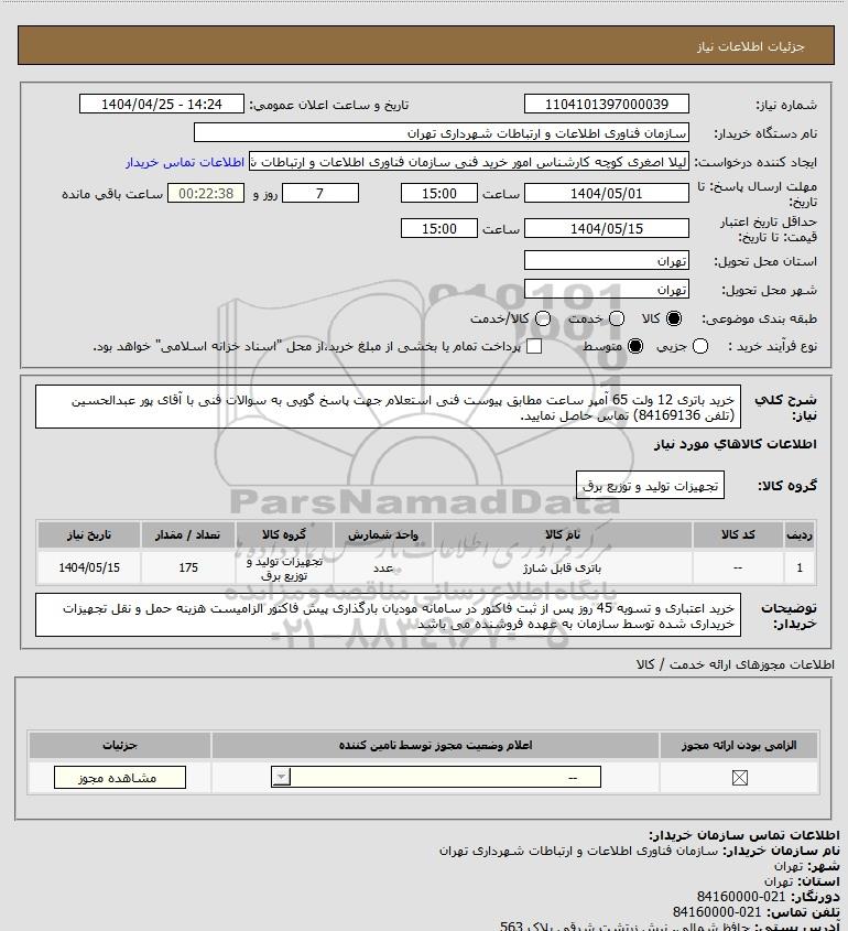 شرح کلی نیاز: خرید باتری 12 ولت 65 آمپر ساعت مطابق پیوست فنی استعلام