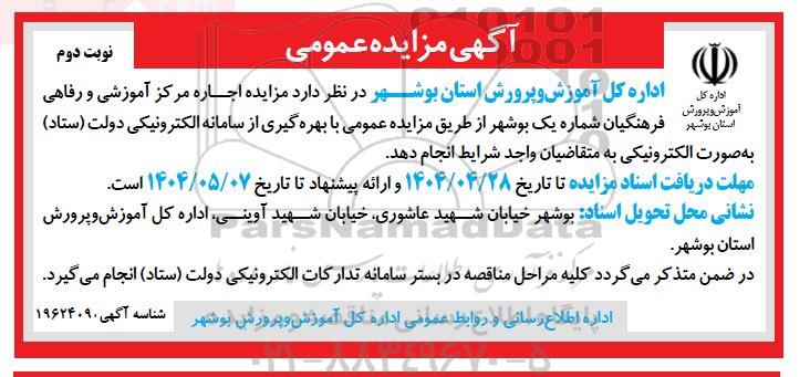 اداره کل آموزش و پرورش استان بوشهر در نظر دارد مزایده اجاره مرکز آموزشی و رفاهی فرهنگیان شماره یک بوشهر از طریق مزایده عمومی با بهره گیری از سامانه الکترونیکی دولت (ستاد) به صورت الکترونیکی به متقاضیان واجد شرایط انجام دهد.
