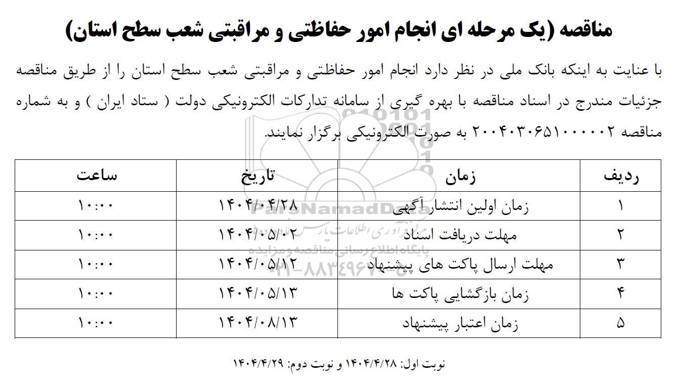 با عنایت به اینکه بانک ملی در نظر دارد امور حفاظتی و مراقبتی شعب سطح استان را از طریق مناقصه جزئیات مندرج در اسناد مناقصه با بهره گیری از سامانه تدارکات الکترونیکی دولت (ستاد ایران) و به شماره مناقصه 2004030651000002 به صورت الکترونیکی برگزار نماید.