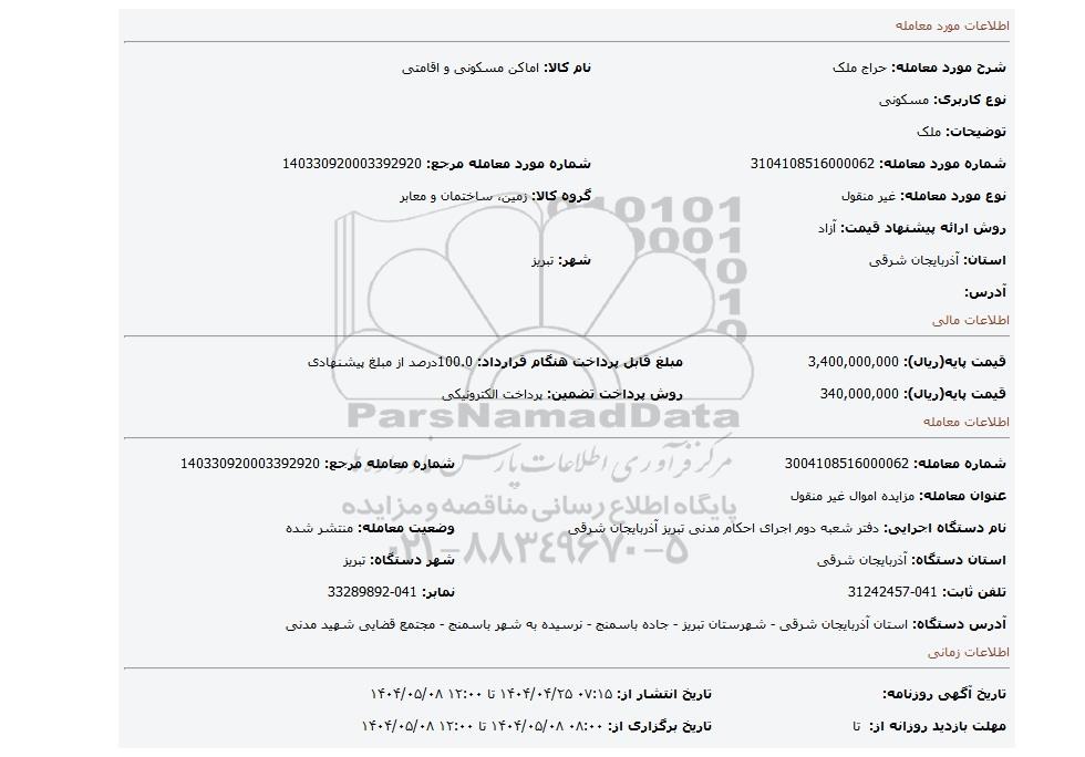 9 مزایده دستور فروش ملک مشاعی 9810687 1404/08/15 new not special not payed آذربایجان شرقی