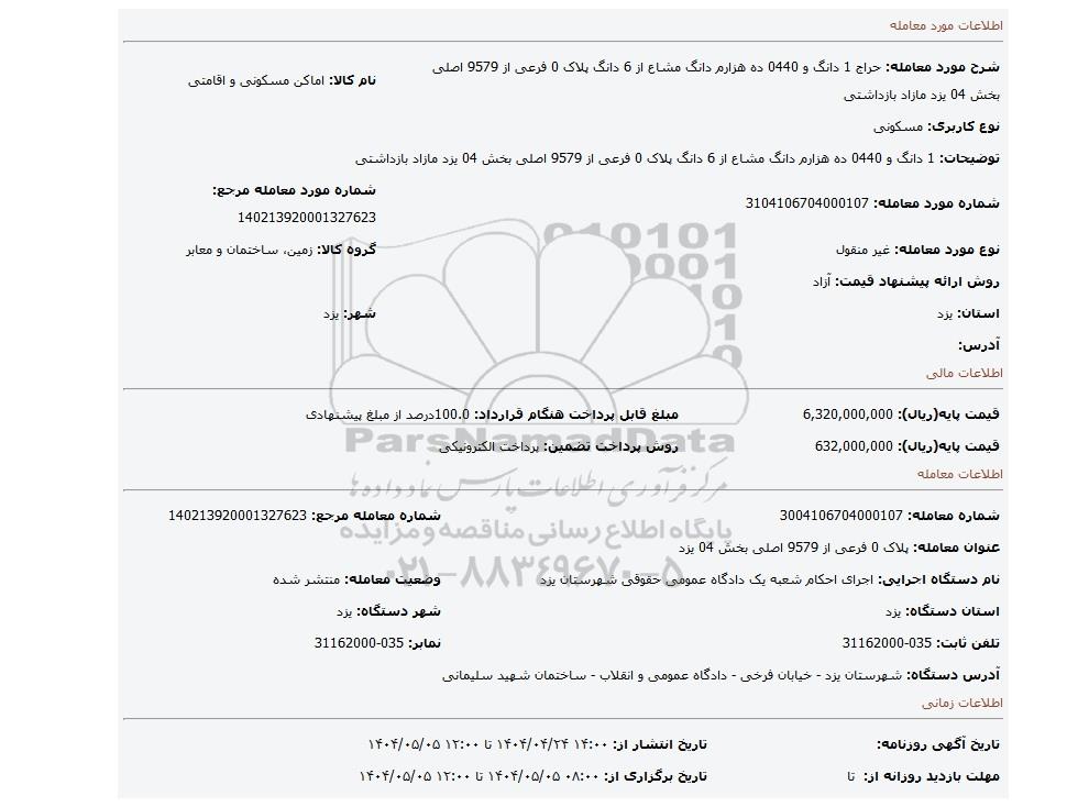 | شرح مورد معامله: حراج 1 دانگ و 0440 ده هزارم دانگ مشاع از 6 دانگ پلاک 0 فرعی از 9579 اصلی بخش 04 یزد مازاد بازداشتی | نام کالا: اماکن مسکونی و اقامتی | |