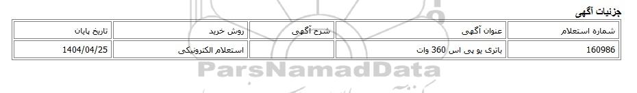 | 160986 | باتری یو پی اس 360 وات | استعلام الکترونیکی | 1404/04/25 |