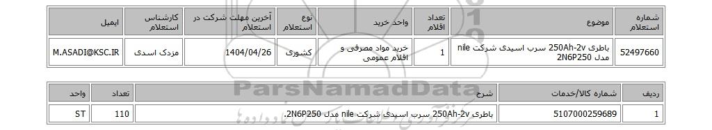 | 52497660 | باطری 250Ah-2v سرب اسیدی شرکت nile مدل 2N6P250 | 1 | خرید مواد مصرفی و اقلام عمومی | کشوری | 1404/04/26 | مزدک اسدی | M.ASADI@KSC.IR |