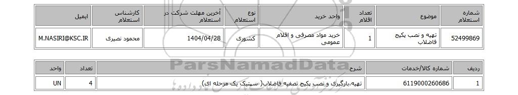 52499869تهیه و نصب پکیج فاضلاب1خرید مواد مصرفی و اقلام عمومیکشوری1404/04/28محمود نصیریM.NASIRI@KSC.IR
