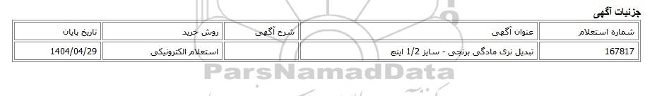| 167817 | تبدیل نری مادگی برنجی - سایز 1/2 اینچ | استعلام الکترونیکی | 1404/04/29 |