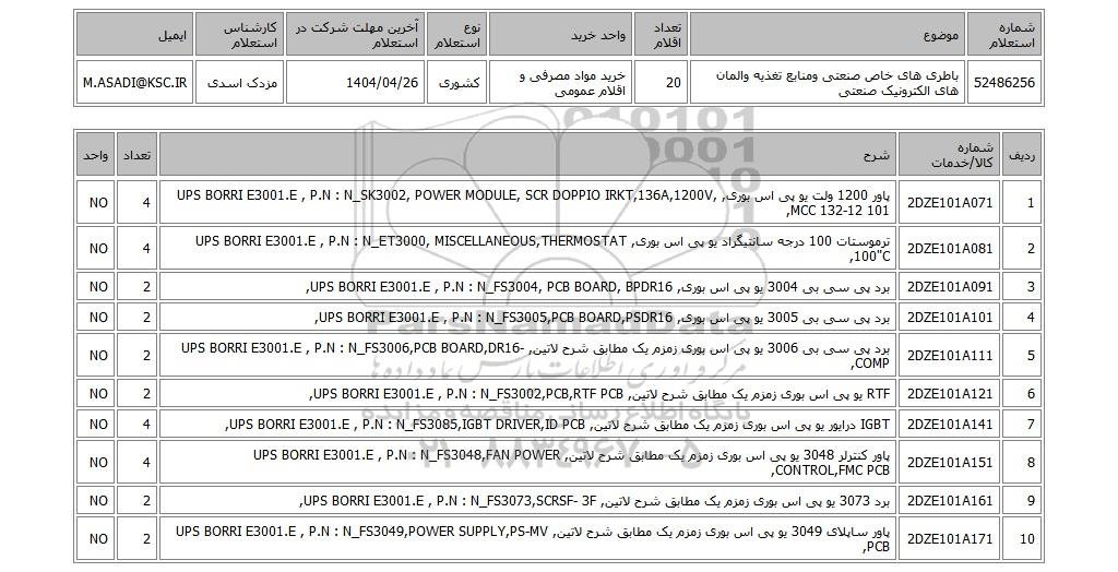 | 52486256 | باطری های خاص صنعتی ومنابع تغذیه والمان های الکترونیک صنعتی | 20 | خرید مواد مصرفی و اقلام عمومی | کشوری | 1404/04/26 | مزدک اسدی | M.ASADI@KSC.IR |