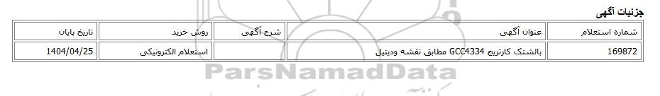 | 169872 | بالشتک کارتریج GCC4334 مطابق نقشه ودیتیل | استعلام الکترونیکی | 1404/04/25 |