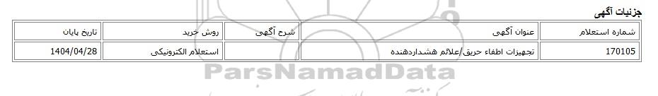 | 170105 | تجهیزات اطفاء حریق/علائم هشداردهنده | استعلام الکترونیکی | 1404/04/28 |