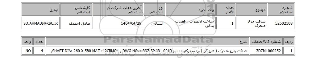 | 52502108 | شافت چرخ متحرک | 1 | ساخت تجهیزات و قطعات یدکی | استانی | 1404/04/29 | صادق احمدی | SD.AHMADI@KSC.IR |