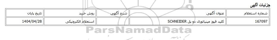 | 167097 | کلید فیوز مینیاتوری دو پل SCHNEIDER | استعلام الکترونیکی | 1404/04/28 |