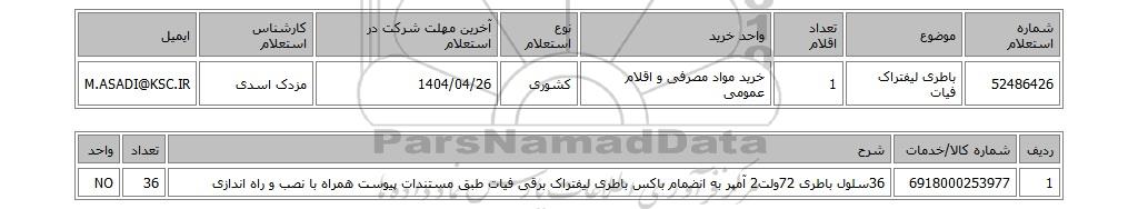 52486426باطری لیفتراک فیات 1خرید مواد مصرفی و اقلام عمومیکشوری1404/04/26مزدک اسدیM.ASADI@KSC.IR