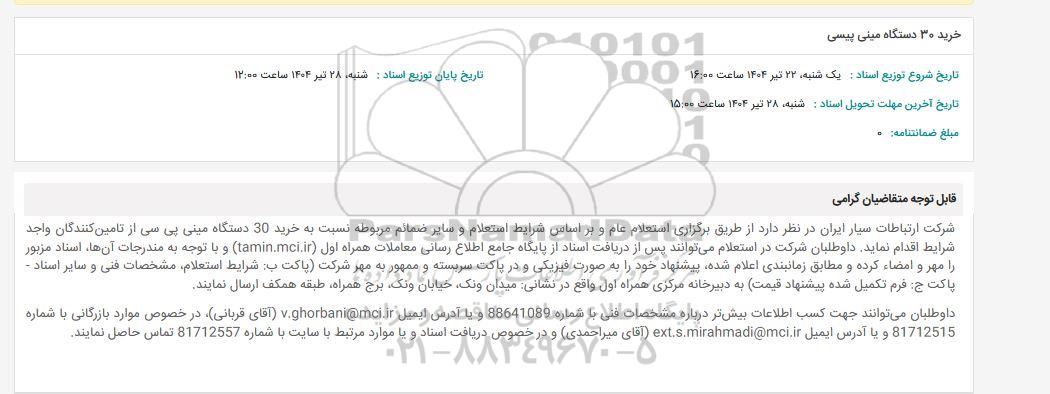 شرکت ارتباطات سیار ایران در نظر دارد از طریق برگزاری استعلام عام و بر اساس شرایط استعلام و سایر ضمائم مربوطه نسبت به خرید 30 دستگاه مینی پی سی از تامینکنندگان واجد شرایط اقدام نماید. داوطلبان شرکت در استعلام میتوانند پس از دریافت اسناد از پایگاه جامع اطلاع رسانی معاملات همراه اول (tamin.mci.ir) و با توجه به مندرجات آنها، اسناد مزبور را مهر و امضاء کرده و مطابق زمانبندی اعلام شده، پیشنهاد خود را به صورت فیزیکی و در پاکت سربسته و ممهور به مهر شرکت (پاکت ب: شرایط استعلام، مشخصات فنی و سایر اسناد - پاکت ج: فرم تکمیل شده پیشنهاد قیمت) به دبیرخانه مرکزی همراه اول واقع در نشانی: میدان ونک، خیابان ونک، برج همراه، طبقه همکف ارسال نمایند.
