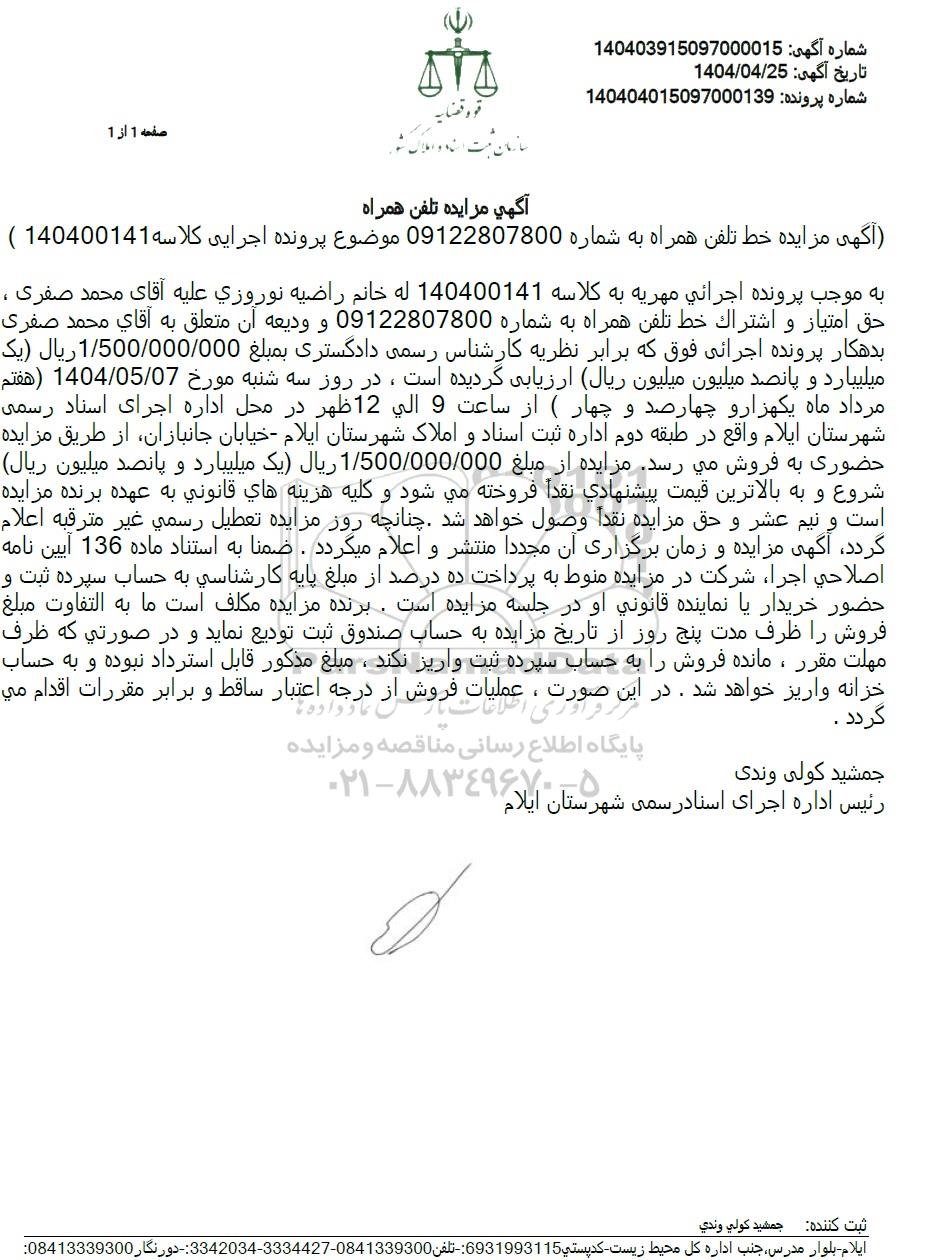 مزایده خط تلفن همراه به شماره 09122807800 کلاسه 140400141