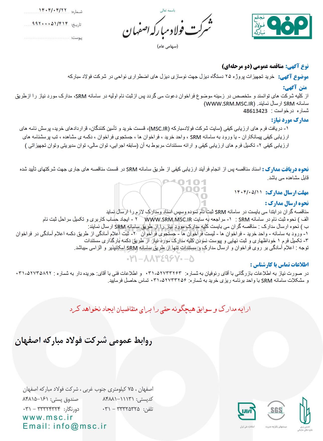موضوع آگهی: خرید تجهیزات پروژه 25 دستگاه دیزل جهت نوسازی دیزل های اضطراری نواحی در شرکت فولاد مبارکه