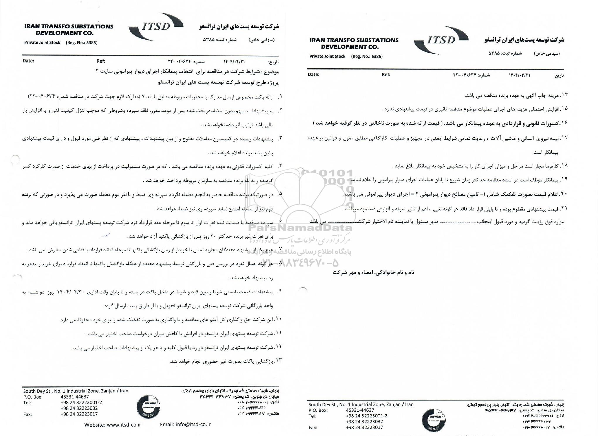 موضوع : شرایط شرکت در مناقصه برای انتخاب پیمانکار اجرای دیوار پیرامونی سایت 2