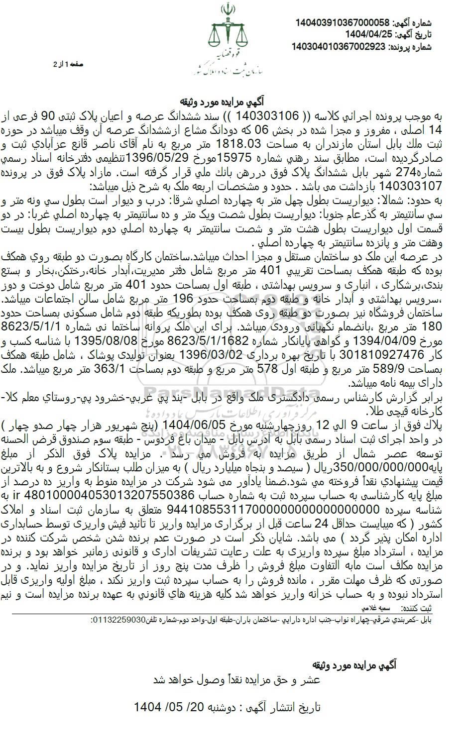موضوع مزایده : عرصه و اعیان پلاک ثبتی 90 فرعی از 14 اصلی، مفروز و مجزی شده در بخش 06 به مساحت 1818.03 مترمربع به ارزش 350.000.000.000 ریال