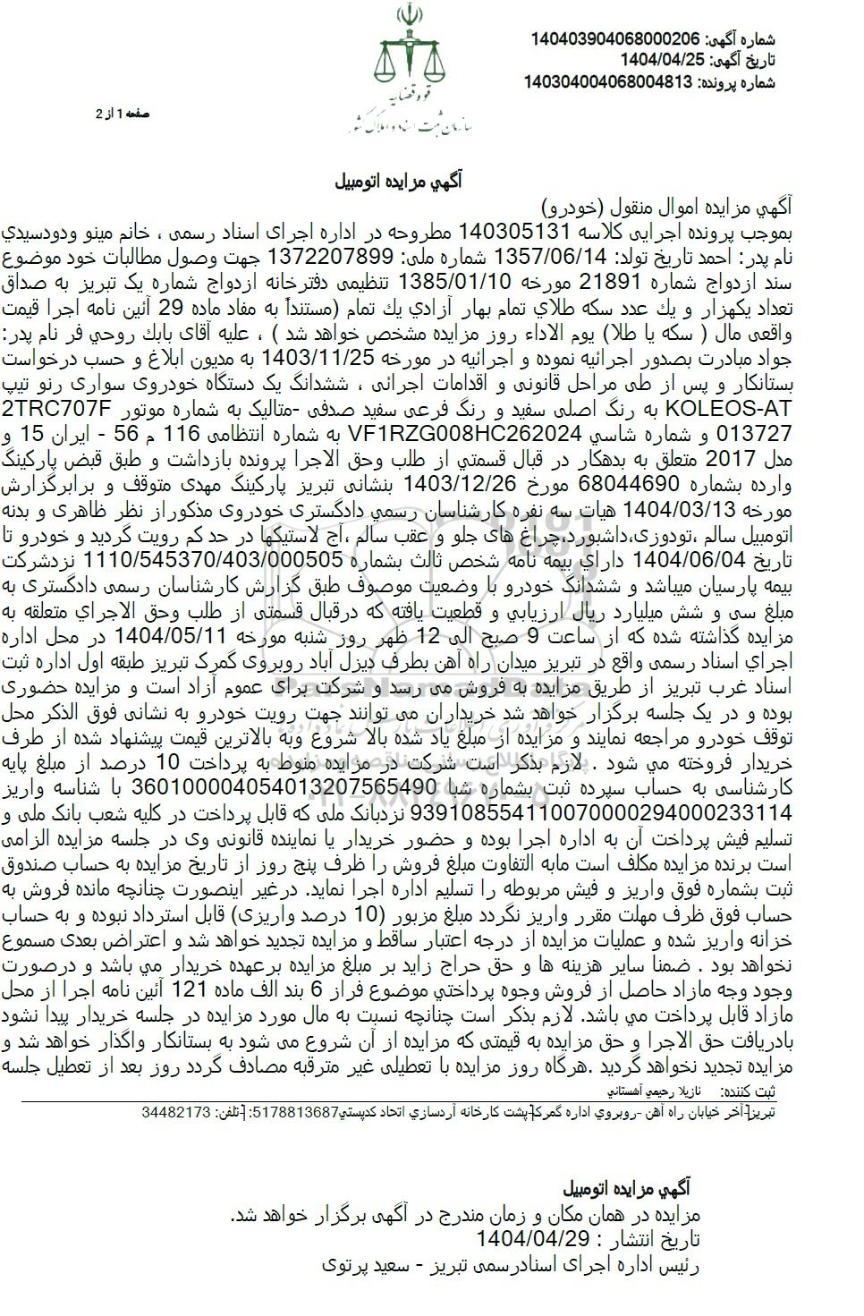 مزایده فروش یکدستگاه خودروی سواری رنو مدل 2017 به مبلغ سی و شش میلیارد ریال