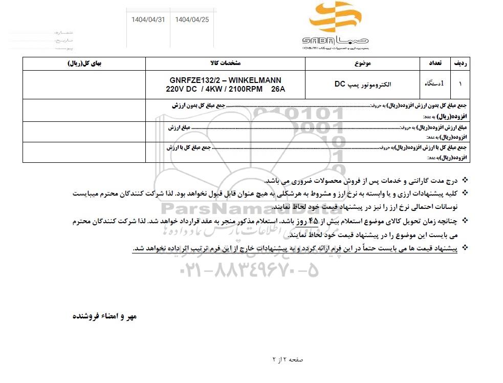 | 1 | الکتروموتور پمپ DC | GNRFZE132/2 - WINKELMANN 220V DC/4KW/2100RPM 26A |