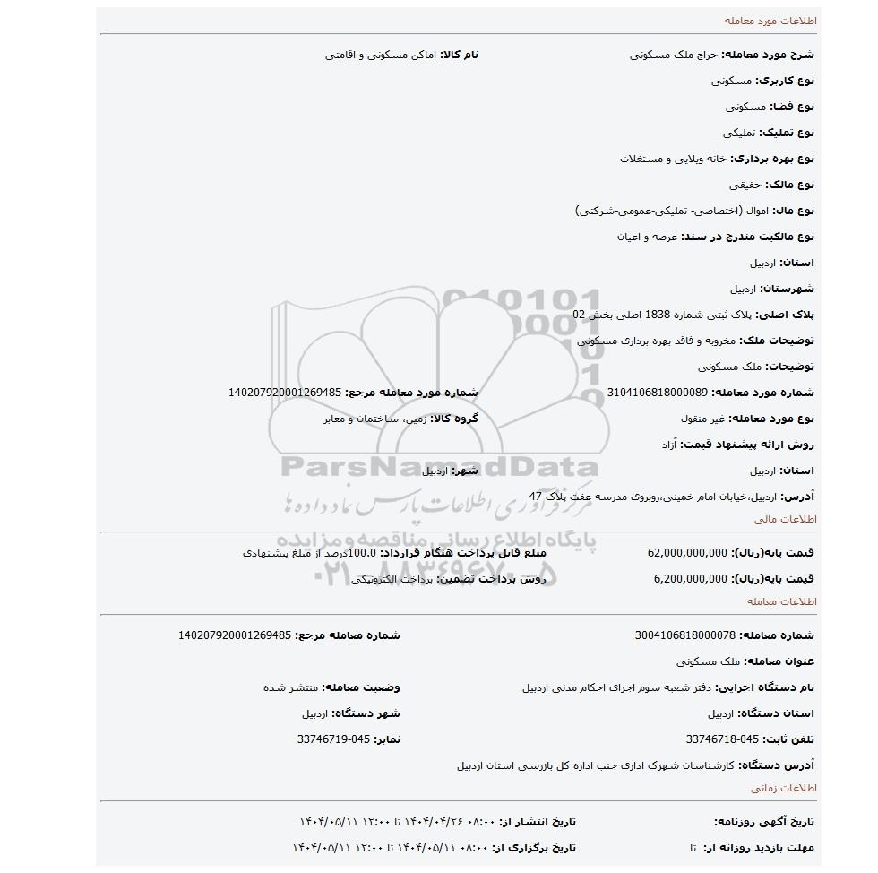 شرح مورد معامله: حراج ملک مسکونی | نام کالا: اماکن مسکونی و اقامتی | |