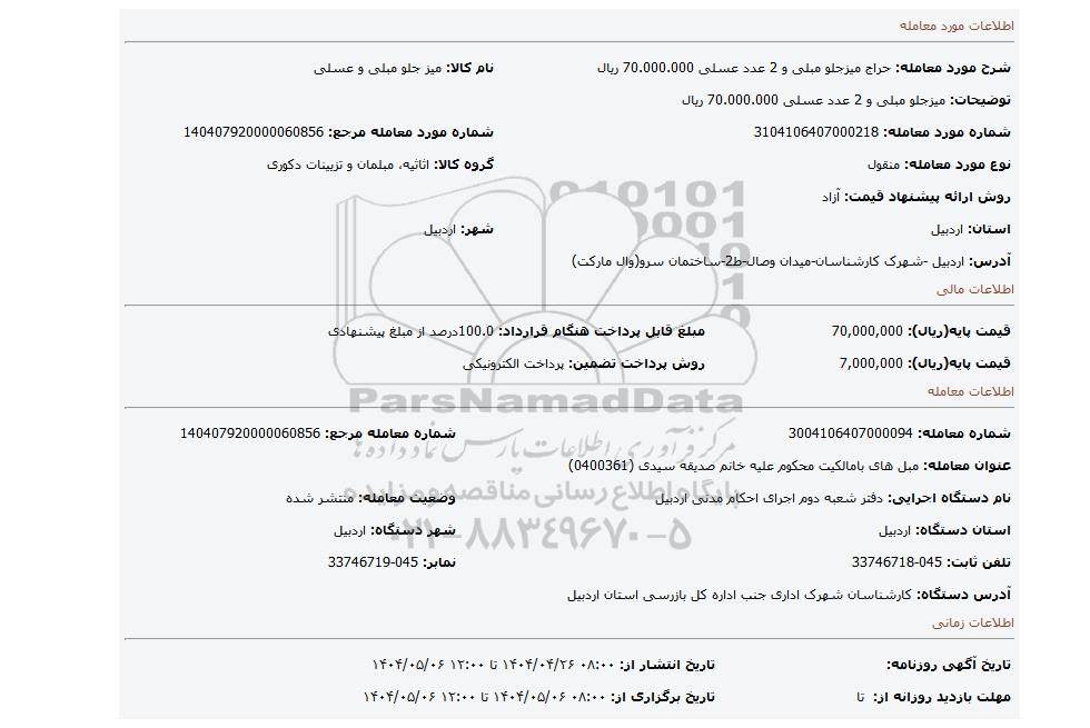 نام دستگاه اجرایی: دفتر شعبه دوم اجرای احکام مدنی اردبیل | وضعیت معامله: منتشر شده | |