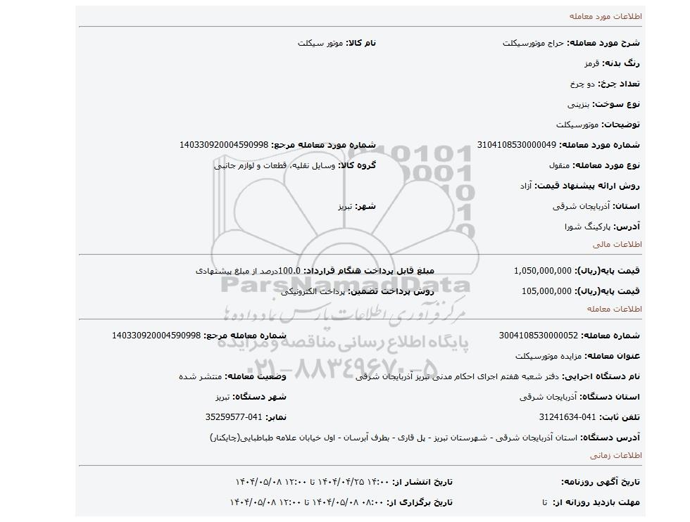 | شماره مورد معامله: 3104108530000049 | شماره مورد معامله مرجع: 140330920004590998 | |