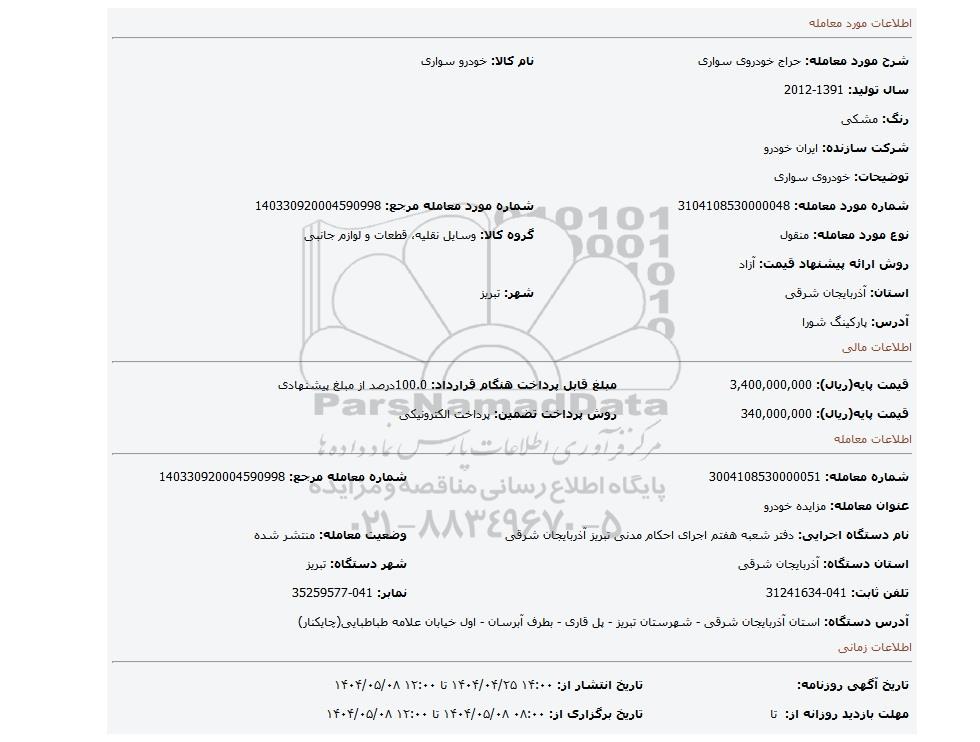 | عنوان معامله: مزایده خودرو | ||