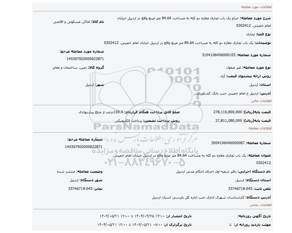 عنوان معامله: یک باب تجاری مغازه دو کله به مساحت 84.64 متر مربع واقع در اردبیل خیابان امام خمینی. 0302412 | ||