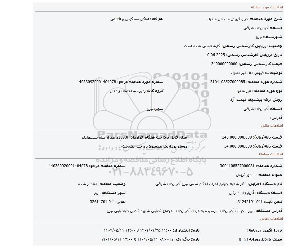 | قیمت پایه(ریال): 34,000,000,000 | روش پرداخت تضمین: پرداخت الکترونیکی |