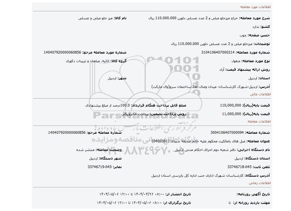 عنوان معامله: مبل های بامالکیت محکوم علیه خانم صدیقه سیدی (0400361) | ||