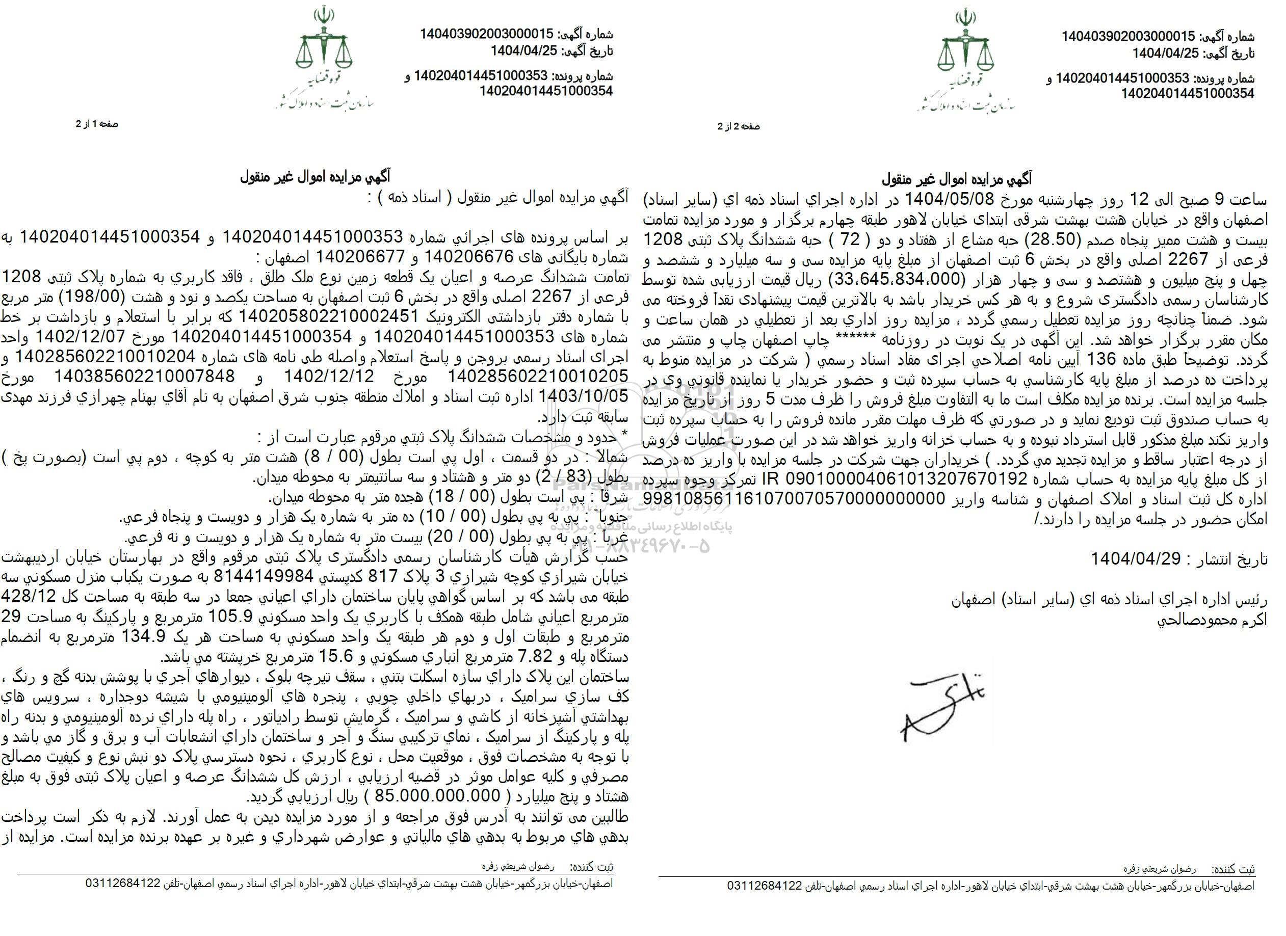 مزایده یک قطعه زمین به مساحت 198 مترمربع پلاک ثبتی 1208 فرعی از 2267 اصلی