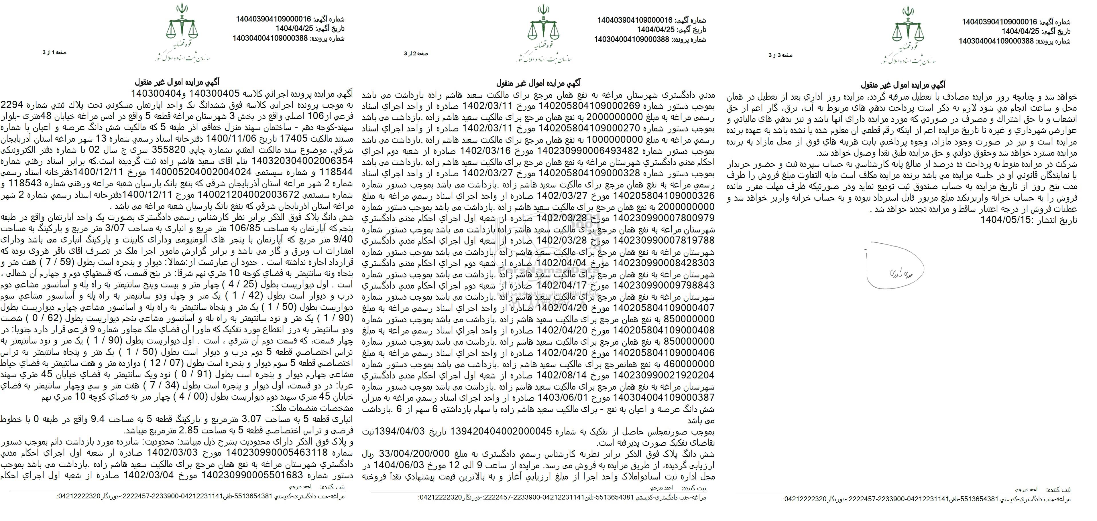 مزایده یک واحد آپارتمان مسکونی تحت پلاک ثبتی شماره 2294 فرعی از 106 اصلی
