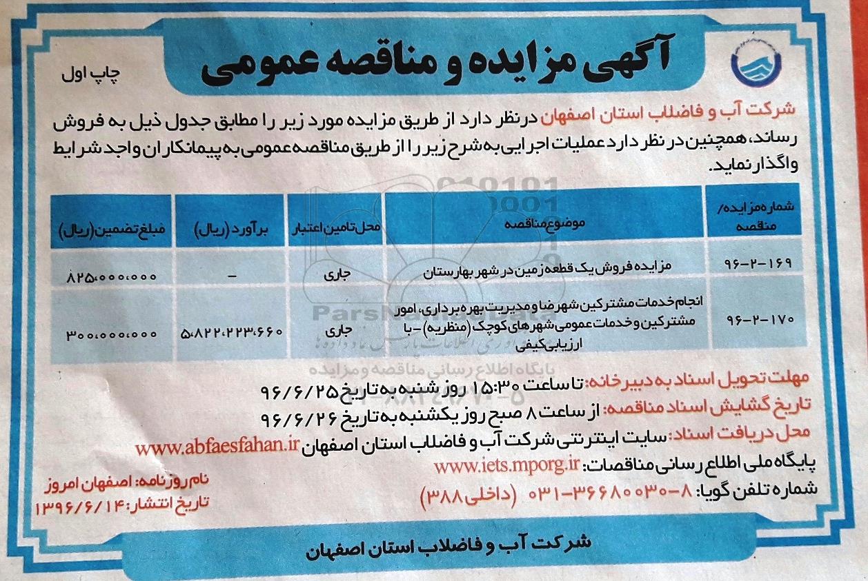 شرکت آب و فاضلاب استان اصفهان در نظر دارد از طریق مزایده مورد زیر را مطابق جدول ذیل به فروش رساند همچنین در نظر دارد عملیات اجرایی به شرح زیر را از طریق مناقصه عمومی به پیمانکاران واجدشرایط واگذار نماید.