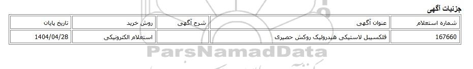 | 167660 | فلکسیبل لاستیکی هیدرولیک روکش حصیری | استعلام الکترونیکی | 1404/04/28 |