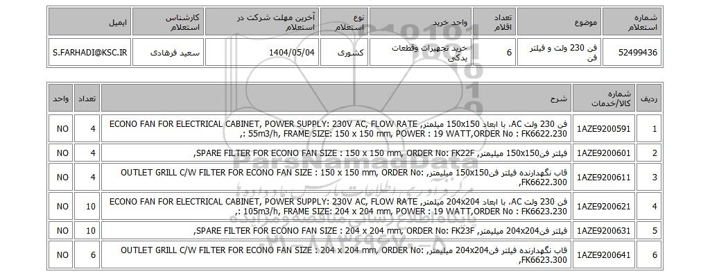 52499436فن 230 ولت و فیلتر فن 6خرید تجهیزات وقطعات یدکیکشوری1404/05/04سعید فرهادیS.FARHADI@KSC.IR