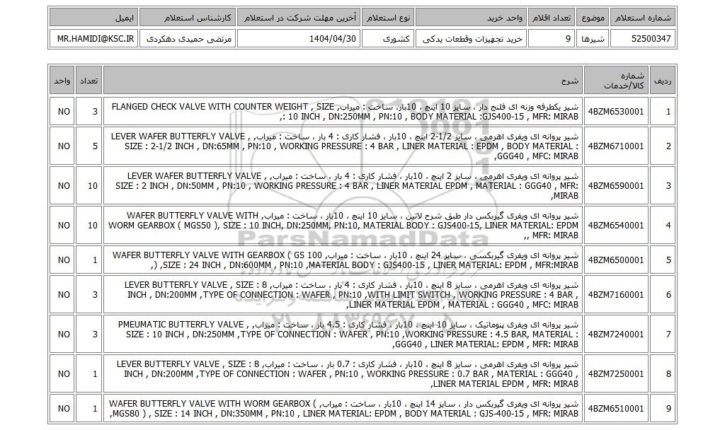 | 52500347 | شیرها | 9 | خرید تجهیزات وقطعات یدکی | کشوری | 1404/04/30 | مرتضی حمیدی دهکردی | MR.HAMIDI@KSC.IR |