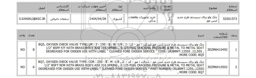| 52501573 | چک ولو برای سیستم طرح جدید لنس مور | 2 | خرید تجهیزات وقطعات یدکی | کشوری | 1404/04/28 | سلمان دانیالی | S.DANIALI@KSC.IR |