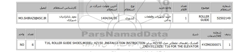 | 52502149 | ROLLER GUIDE | 1 | خرید تجهیزات وقطعات یدکی | کشوری | 1404/04/30 | محمد بابانژادیان شیرازی | MO.SHIRAZI@KSC.IR |