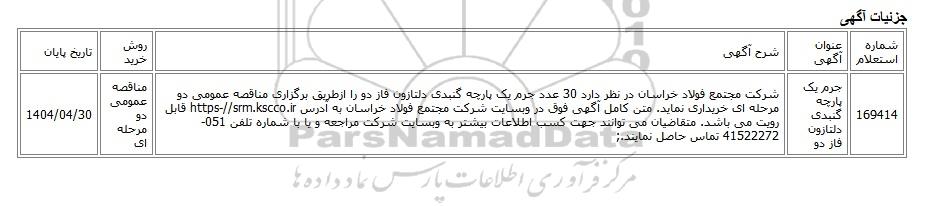 | 169414 | جرم یک پارچه گنبدی دلتازون فاز دو | شرکت مجتمع فولاد خراسان در نظر دارد 30 عدد جرم یک پارچه گنبدی دلتازون فاز دو را ازطریق برگزاری مناقصه عمومی دو مرحله ای خریداری نماید. متن کامل آگهی فوق در وبسایت شرکت مجتمع فولاد خراسان به آدرس https-//srm.kscco.ir قابل رویت می باشد. متقاضیان می توانند جهت کسب اطلاعات بیشتر به وبسایت شرکت مراجعه و یا با شماره تلفن 051-41522272 تماس حاصل نمایند.; | مناقصه عمومی دو مرحله ای | 1404/04/30 |