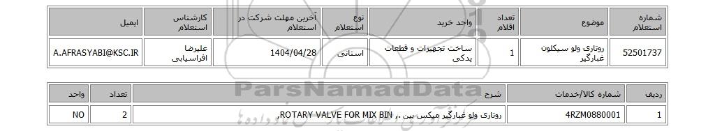 52501737روتاری ولو سیکلون غبارگیر 1ساخت تجهیزات و قطعات یدکیاستانی1404/04/28علیرضا افراسیابیA.AFRASYABI@KSC.IR