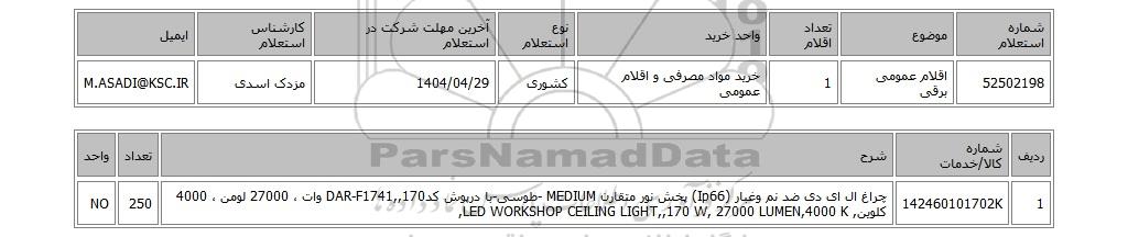 52502198اقلام عمومی برقی1خرید مواد مصرفی و اقلام عمومیکشوری1404/04/29مزدک اسدیM.ASADI@KSC.IR