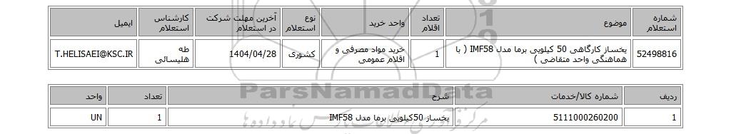 52498816یخساز کارگاهی 50 کیلویی برما مدل IMF58 ( با هماهنگی واحد متقاضی )1خرید مواد مصرفی و اقلام عمومیکشوری1404/04/28طه هلیسائیT.HELISAEI@KSC.IR